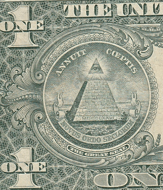 Det er dette åndevæsens ene altseende øje, der ser ud fra illuminat-pyramidens slutsten. Screenshot fra US 1-dollar seddel.